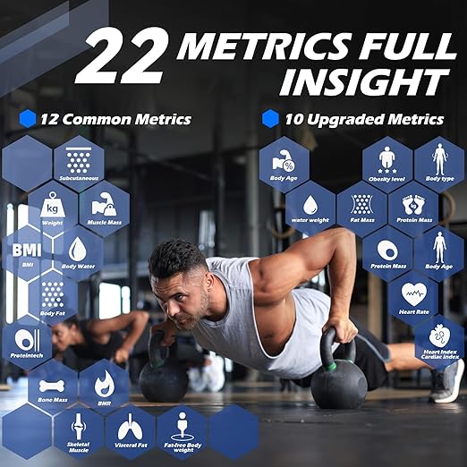 - MORE COMPREHENSIVE BODY METRICS, KNOW YOURSELF MORE: Far surpassing other weight scale with body fat and muscle, our upgraded smart scale with Bioelectrical Impedance Analysis, calculates 22 biometrics: body scale with Body Fat and Muscle Mass, BMI, Water Weight, Weight, Visceral Fat, Heart Rate, Body Water, Bone Mass, BMR, Protein, Fat-free Body Weight, Subcutaneous Fat, Skeletal Muscle, Heart Index, Body Age, Muscle Rate, Fat Mass, Protein Mass, Ideal Body Weight, Obesity Level, Body Type