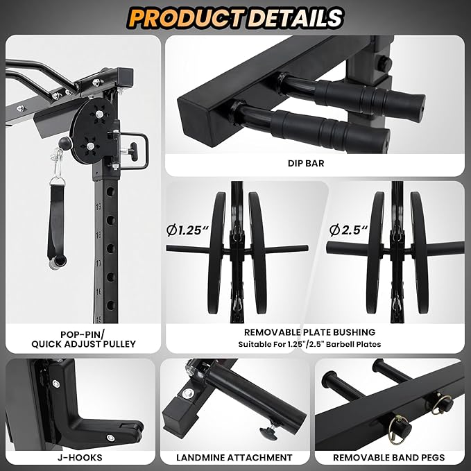 - FULLY EQUIPPED FOR WORKOUTS: No need to buy the extra fitness accessories. All come with home gym squat rack. We provides 23 free attachments, 2 Nylon Safety Straps, 2 J hooks, 2 Dip bars, 4 Resistance Band Pegs, a Lat Pull Down Bar, a Cable Bar, a 360 degree Detachable Landmine, a Ankle Strap, a Tricep Rope, 2 Cable Handles, a Chain, 4 Weight Holder Clips and a Footboard.