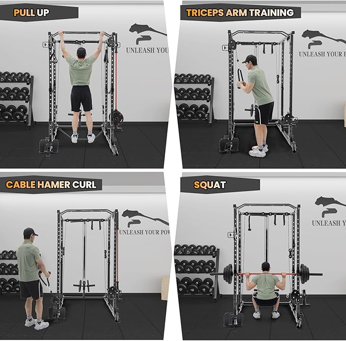 - ENDLESS TRAINING POSSIBILITIES: No home or garage gym should be without a power rack. Our power cage can bring power rack, cable Cross-Over machine, lat pulldown station, low row station (includes footplate attachment), chin station, dip station, core trainer, landmine station to your home gym at the same time. You can train your full-body with just one device. It can be used by multiple family members at the same time, making it perfect for your home gym.