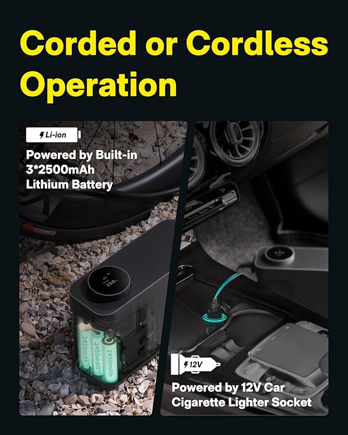 - DUAL POWER OPTION: Our tire inflator offers flexibility with both a built-in array of 2500 mAh*3 lithium batteries for wireless operation and a 12V DC car connector for continuous usage (Please Note: In this state, the machine will run normally, but it cannot be charged). Perfect for situations where efficiency and convenience are essential