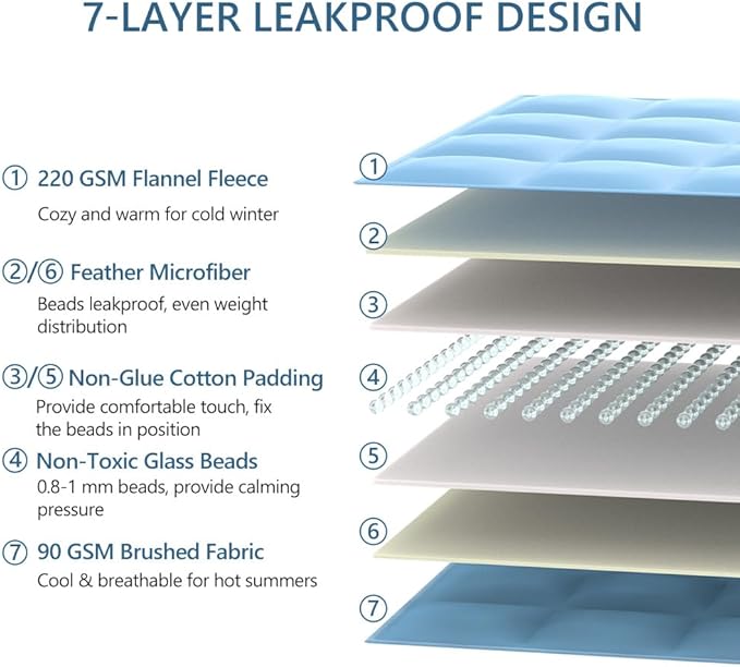 - Easily Care & Machine Washable: This 5 lb weighted blanket is easy to clean and maintain. It can be machine washed or tumble dried. We recommend washing in cold water and tumble drying or air drying on low. No bleaching or ironing is required.The 7-layer design and tight alignment stitching prevents beads from leaking, so you can use it with confidence. We provide a full range of considerate service, if you have any questions about our adult weighted blanket, you can ask us at any time