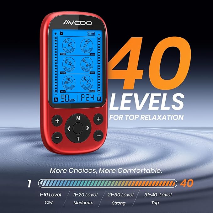- Versatile Relief Options in One TENS Machine: Equipped with 40 levels and 24 pre-programmed modes, this muscle stimulator for pain relief provides you the relief experience of graduated therapy without sudden shocking. The therapy duration can be adjusted up to 90 minutes in the continuous mode. The TENS Unit for back pain with A/B channels offers flexible relaxation options using either 2 or 4 pads at a time.
