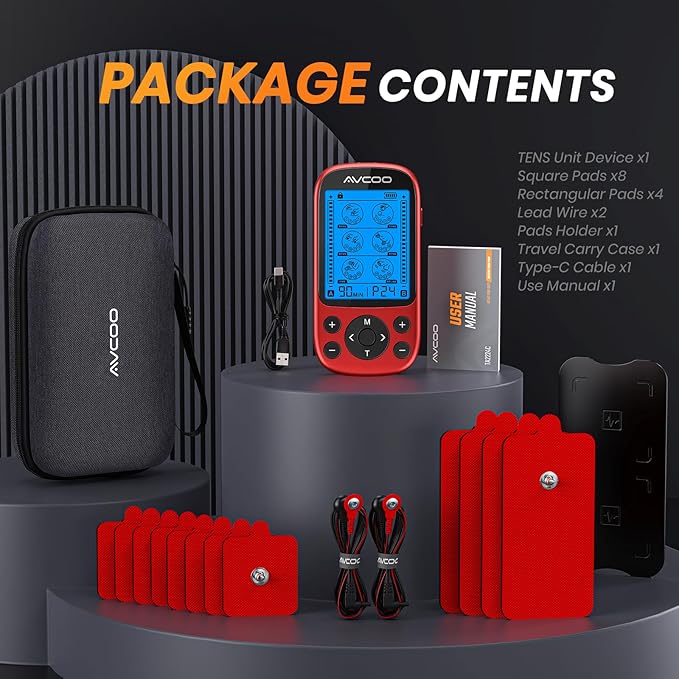 - Complete TENS Device Kit: This package contains the following: 1 AVCOO Stim Machine, 12Pcs electrode pads (4 rectangular pads in 2'' x 4'' and 8 square pads in 2'' x 2''), 2 x Lead Wires, 1 x EVA travel carry case, 1 x Pads Holders, 1 x Type-C Cable, 1 x User Manual, 24 Months Customer Service and Lifetime Technique Support.