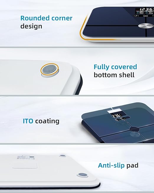 - ADVANCED AND ACCURATE MEASUREMENT TECHNOLOGY: We use ITO coating on the scale surface, which can provide a larger sensing area, suitable for feet of all sizes, and a high-precision gravity sensor accurate to 0.1lb/0.05kg provides accurate data for each measurement.