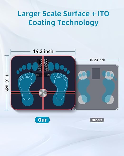 - LARGE SCALE SURFACE DESIGN: Our weight scale has an extra-large scale surface of 14.2"*11.8", which ensures that your feet can be completely placed on it, and you will never be unable to use it because the scale is small, which improves comfort and usability. The full bottom shell and rounded corners of the scale prevent tipping and collision.