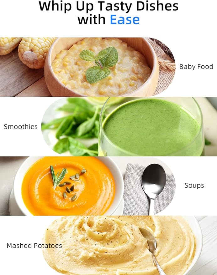 - Versatile Attachments: Includes egg beaters for whipping, a potato masher for mashing, and a chopper/food processor for versatile meal prep.