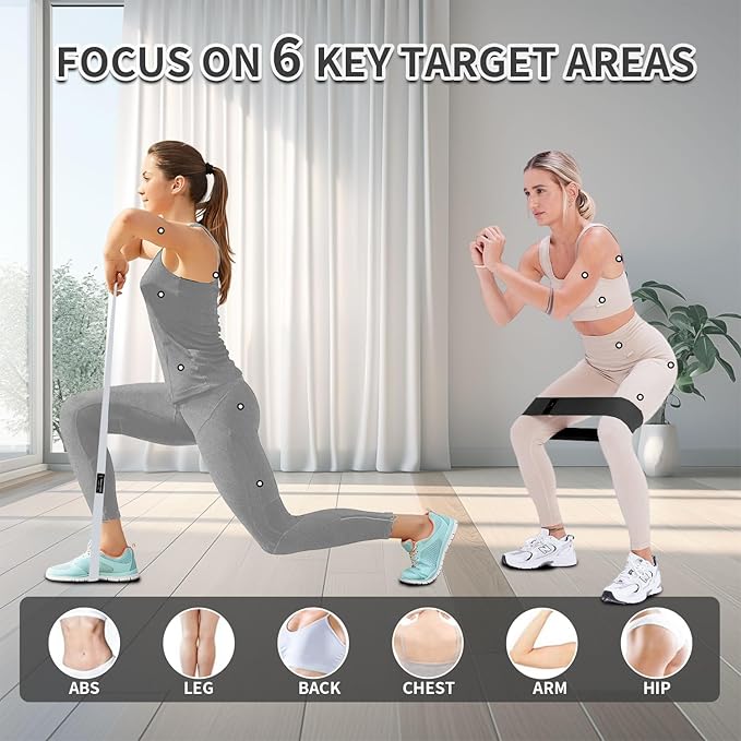 - 【What You Get】: 6 fabric resistance bands of different colors and resistance, 2 hair ties for tying hair, Soft tape measure for measuring body measurements, portable travel carry bag and instruction guide.