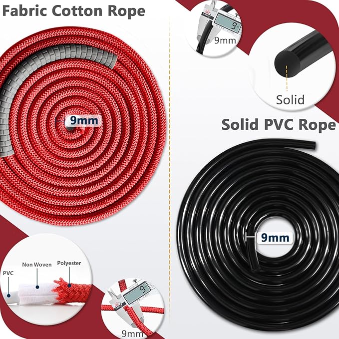 - 【2 Durable & Adjustable Ropes Combination】Skipping rope featuring a premium combination of a 9mm Thickened Cotton Rope(10ft) and a 9mm Solid PVC Rope(10ft), allowing you to easily switch between different training ropes to achieve various training goals. Suitable for a wider range of surfaces, it adds variety and excitement to your daily jump rope routine, remaining durable even after extended workouts