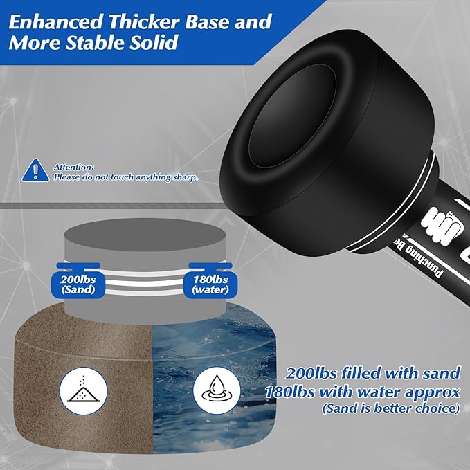 - Ultra Stable Base: Large size and Made of thickened PVC material make the boxing heavy bag more durable, which can hold 180lb of water or 200lb of sand, Can withstand prolonged kicks and punches