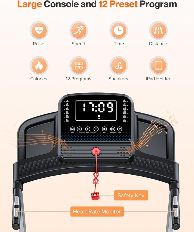 - 【Multi-Function LED Display Console with Speaker】This electric treadmill features a multifunctional LED display that shows speed, distance, time, calories, and pulse in real time. Easily adjust your speed using the 1-touch button, App, or voice control. With 12 preset programs and 3 countdown modes, you can personalize your workout to achieve your fitness goals. Plus, the built-in speaker lets you wirelessly sync and enjoy your favorite music while exercising.