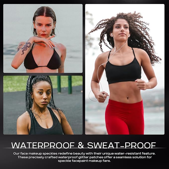 - WATERPROOF FACE GLITTER FRECKLES : Whether you're working out at gym, spending a day by pool, or enduring inclement weather, our face paint spots will stay in place and maintain their vibrant colors and perfect finish.