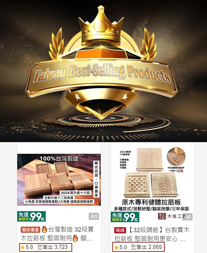 - TAIWAN'S NO. 1 BRAND OF SLANT BOARD - More than 10,000 sets have been sold in Taiwan. Our Wooden Slant Board for calf stretching awarded the top ten commemorative labels in Taichung, Taiwan, and obtained Taiwan patent certificate, certificate number D220706.
