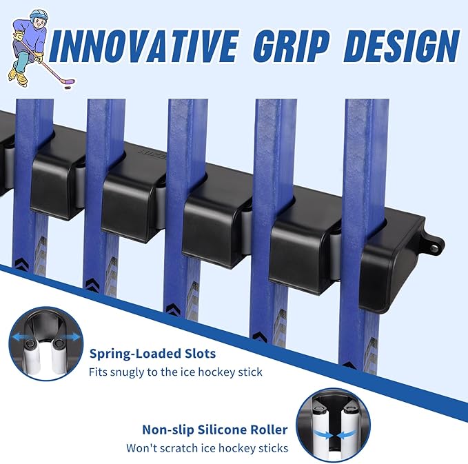 - [SECURE - STABLE CLAMPING] Hikeen Hockey stick wall mount features unique spring loaded grooved rollers and non-slip rubber construction for strong clamping force and non-slip function to securely hold your hockey stick, unlike other grooves on the market that are too wide and easy to fall off. Say goodbye to the worry of hockey stick slipping and damage, safely protect your valuable hockey stick.