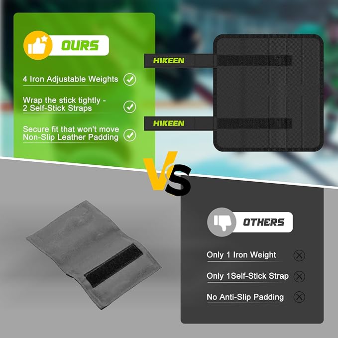 - [ FIRM FIT ] The pro hockey stick weight comes with two 7in. heavy-duty self-stick straps that easily fit around the end of your hockey stick. Even when swinging a hockey stick vigorously, the weights wrap securely and tightly around the stick so the weights won't fall off during practice.