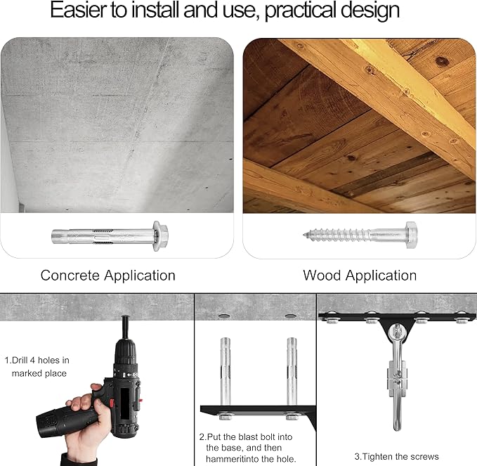 - Easy Installation: Pre drill four holes according to the four hole positions of heavy bag hanger, use expansion screws for concrete surfaces, and use wood screws for wood