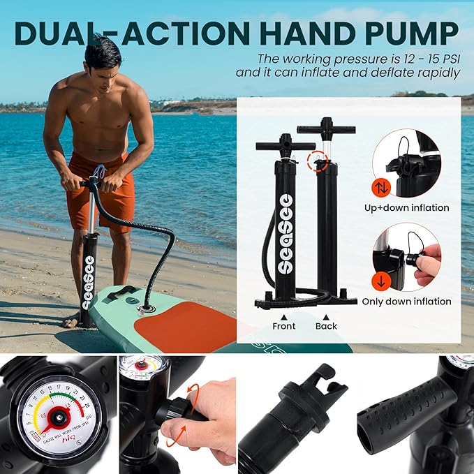- 【SUP Accessories】 Floating paddle , double action hand pump with psi gauge, 3 removable fins, safety leash, SUP manual, repair kit and a backpack. Just put all in your backpack and you've got everything you need to hit the water.
