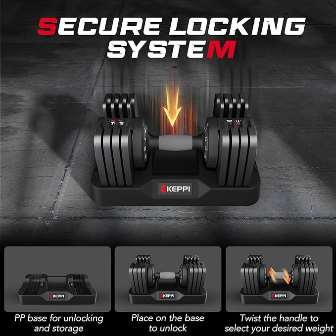 - Secure Locking System - Dual safety protection:base unlocking system and dial system work together.8 safety slots firmly lock the dumbbell plates for enhanced stability and safety.
