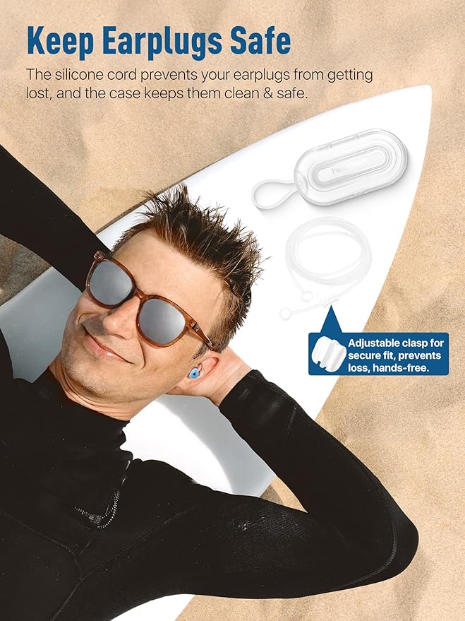 - Secure and Adjustable Fit: Featuring ergonomic wings and customizable ear tips (S, M, L), these earplugs provide a snug, personalized fit for most ear sizes. The adjustable connecting cord and clasp keep them securely in place, even during intense water activities, and prevent loss.