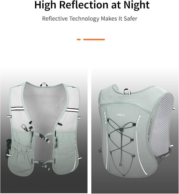 - 【Breathable and Ergonomic Design】 Ecohub running hydration vest engineered with 3D contour stitching that follows spinal curvature, reduces vest shift and bouncing during runs. The breathable rhombic ventilated mesh design keeps your back cool by maintaining air circulation, preventing discomfort due to accumulated heat. (PATENT PENDING)