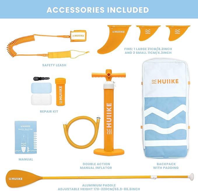 - All the accessories you need - The “Enjoyer - Essential” collection include everything necessary to practise paddleboarding: blue stand up paddle board, backpack, safety leash, pump, aluminum paddle, 3 fins, repair kit and manual