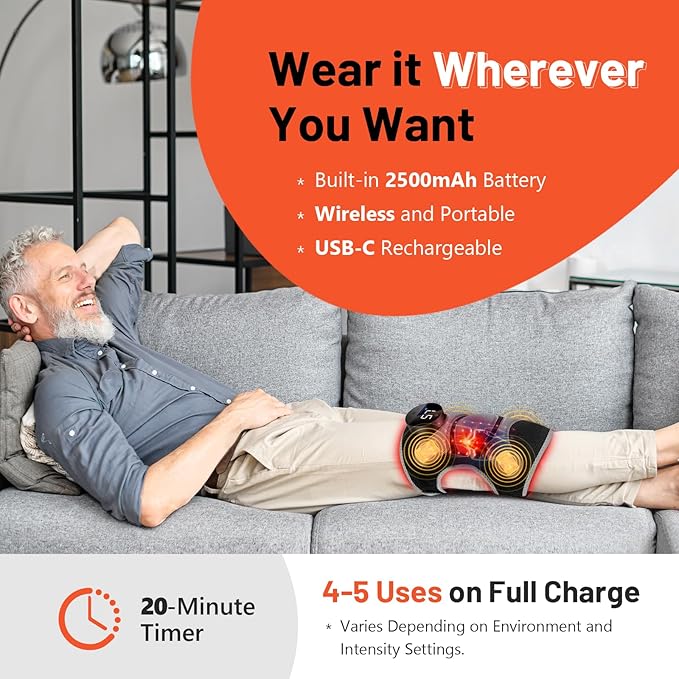 - HEATED VIBRATION MASSAGE - The knee massager uses a unique three-level vibration and heat therapy to massage deep tissues, which can more effectively alleviate various types of knee pain, including joint pain, runners' knees, and post exercise soreness. Heat can improve blood circulation and recovery. Five heating zones design to provide you with comprehensive heat.
