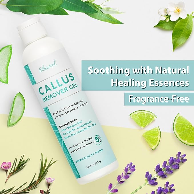 - Soothing & Calming Foot Care - infused with Tea Tree Oil, Eucalyptus Oil, Lavender Oil, and Green Tea, this feet callus remover gel helps calm and soothe irritated skin while supporting the skin's natural healing process. This heel big toe callus remover is good for all skin types and has a slight lavender and chemical scent. Regular use effectively prevents dry, cracked, and callused skin, restoring overall foot health and improving texture and appearance. This corn and callus remover for feet is ideal for runners, people on their feet all day, high heel wearers, and general foot upkeep