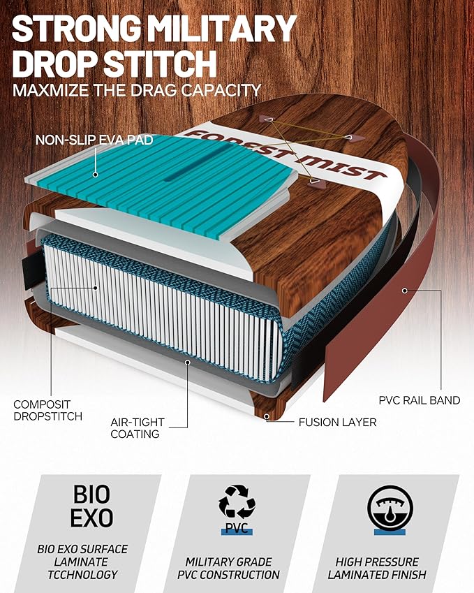 - 【Forest Mist Design & Premium Material】Quickly inflates and deflates for portability, you can carry to anywhere you dreamed for. Boierto use a High tech process to transform military-grade PVC into a rock-solid rigid platform. With a core of composite drop-stitch fibers connected to the nearly indestructible outer skin, the inflatable boards stand up to anything you want to do on the water
