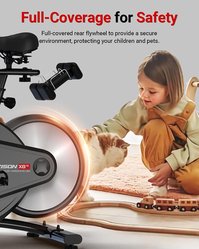 - Exercise Bike with Fully Enclosed Flywheel: The HARISON se-mi commercial exercise bike HR-X8 features a 360° fully enclosed flywheel design, significantly enhancing user safety by eliminating risks of accidental injuries. This innovative enclosure system not only ensures quieter operation for a more peaceful home workout environment but also effectively prevents dust and debris accumulation. The protective cover extends the equipment's durability while minimizing maintenance requirements, making it an ideal choice for your home gym.