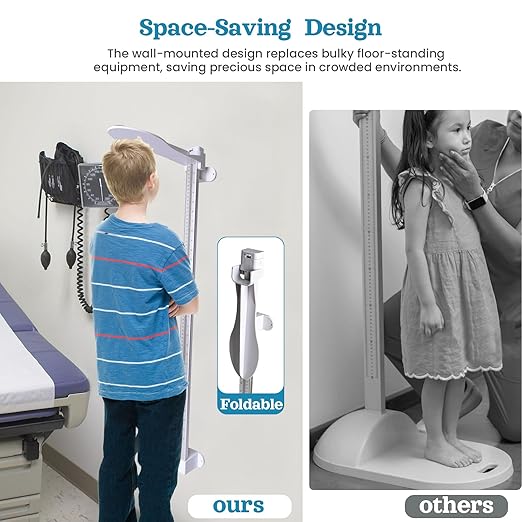 - Extra-Wide Platform & Space-Saving Design – Features a 15” x 12” wide platform for enhanced stability and safety, while the foldable, wall-mounted stadiometer maximizes space, perfect for clinics, gyms, and homes with limited room