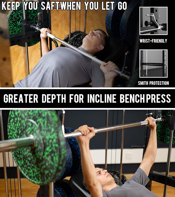 - 【11-In-1 Home Gym Station】E5 smith machine combines Power Cage/Functional Trainer/Cable Crossover/Two Lat Pull down Station/ Smith Machine /Vertical Leg Press/Chin Station /Dip Station /Core trainer/Landmine Station /Suspension Trainer. The guide rails (premium solid steel) deliver ultra-smooth movement with bearings during the workouts, as well as safe lock and release mechanics and safety arms allowing the users to max out their training safely