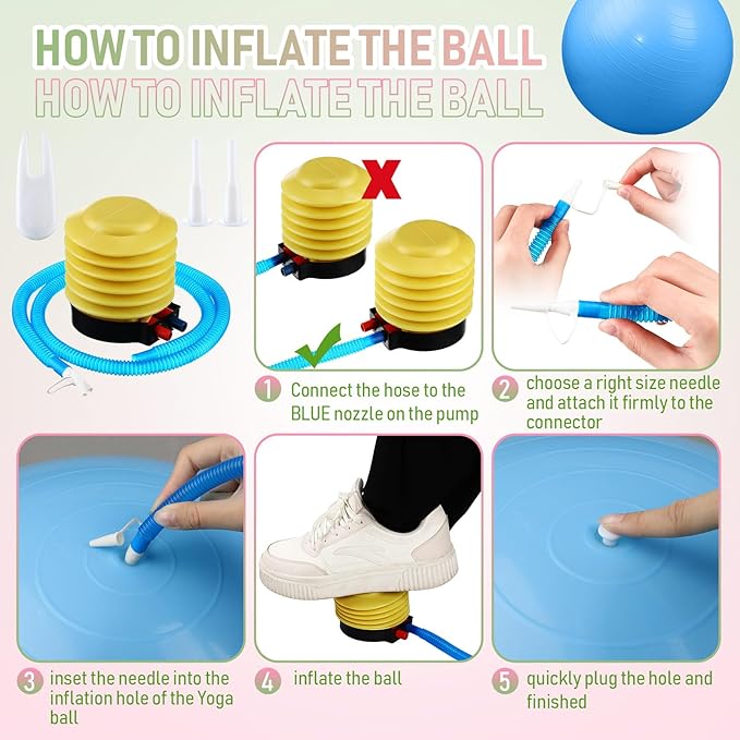 - Various Colors: you will receive 4 pieces of exercise balls for working out in different macaron colors, 1 piece of each color, equipped with 1 piece of foot pump, 1 piece of air pull, and 2 pieces of air plugs; The complete set can meet your exercise needs
