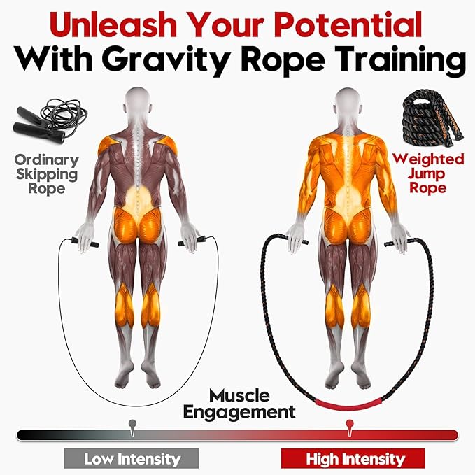 - Perfect Choice for Fitness, Healthy': It's no secret that skipping rope is a great way to get fit. Using a heavy jump rope helps to exercise the whole body more effectively. Triple-weighted, multi-fold fat burning! Each energizing leap ignites calorie burning, boosts stamina, and promotes weight loss. Enhance everyday life quality; in order to better yourself, please use weighted jump ropes to jump now