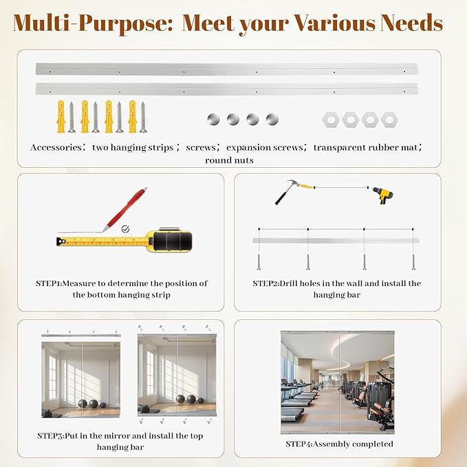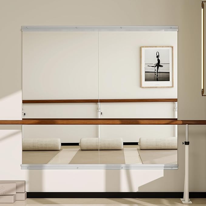 - Easy To Install: Come with installation hardware. Fix the silver metal strip at the bottom, then insert the panel into it, and finally secure the top hook. No professional help needed—wall-mount dance mirror firmly and start training