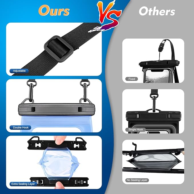- [A Must-Have For Vacation &Cruising] This waterproof cell phone pouch features a double hook design that is strong and durable. The adjustable lanyard provides versatility and style, allowing you to wear it diagonally, over one shoulder, etc. without worrying about strangling your neck, fully enjoy your happy hour