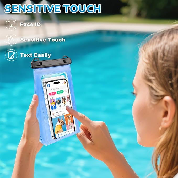 - [Clear and Smooth Operation] The IPX8 cell phone waterproof pouch with high transparency design, and high sensitivity allows you to focus easily and take sharper photos for photo/video needs, smooth touch even in wet conditions, face recognition support, and clear sound for video calls. Don't let the fogged screen or unresponsive touch affect your travel. Small body, big space, not bulky