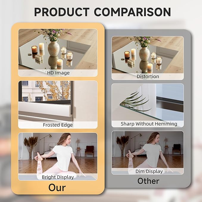 - Fits Any Room with Ease: Measuring 55.1"x23.6", this sleek frameless mirror is the perfect addition to fitness rooms, bedrooms, or studios. Whether you're checking your form, outfit, or enhancing your decor, it blends in effortlessly.