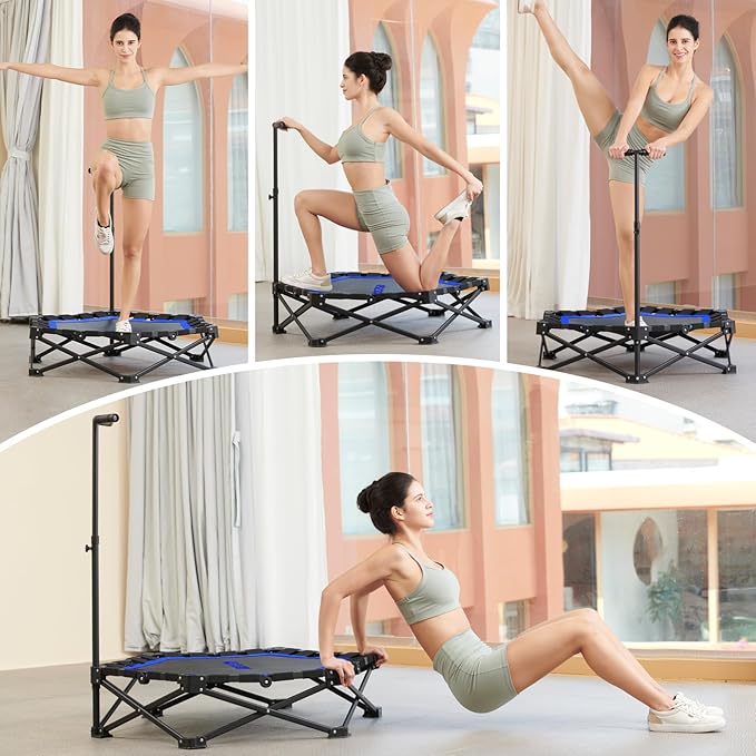 - Versatile Usage: Easily move the trampoline indoors or outdoors for aerobic exercise. 10 minutes of jumping is equivalent to 1 hour of jogging, helping to improve cardiovascular health and burn fat. It serves as a joint-friendly fitness trampoline for adults seeking low-impact cardio workouts and an energetic play trampoline for kids.