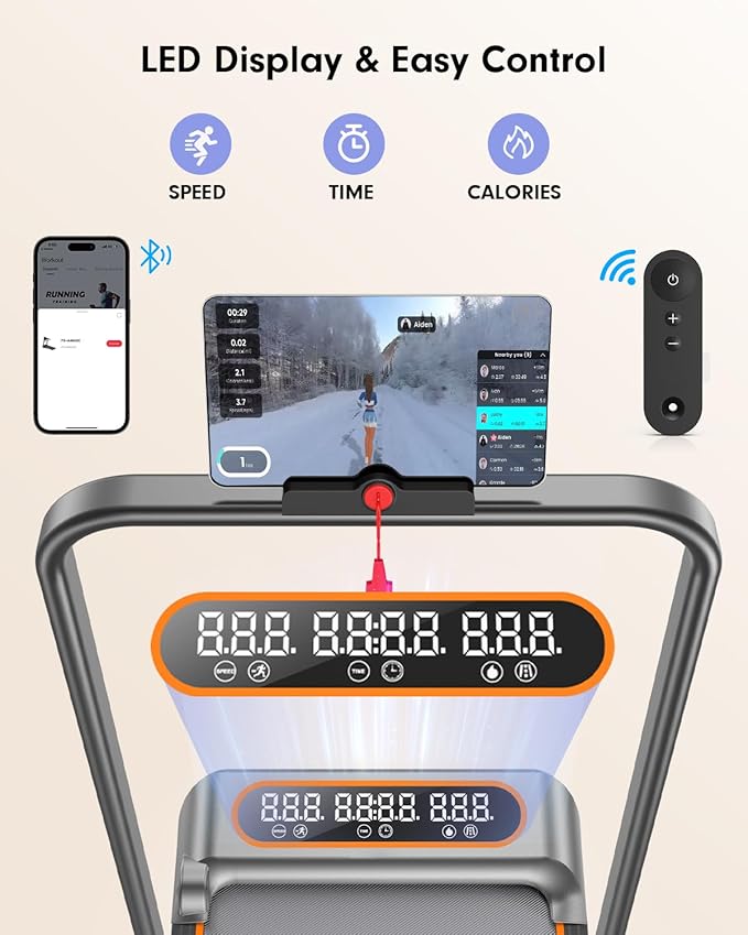 - Remote Control & LED Display: The LED screen and Fitness app display essential metrics like speed, calories burned, time and distance. App allows you to customize training plans and enjoy more social experience. With the remote control, you can adjust the speed for your desired fitness modes at any time, which make your exercise more convenient and simple.