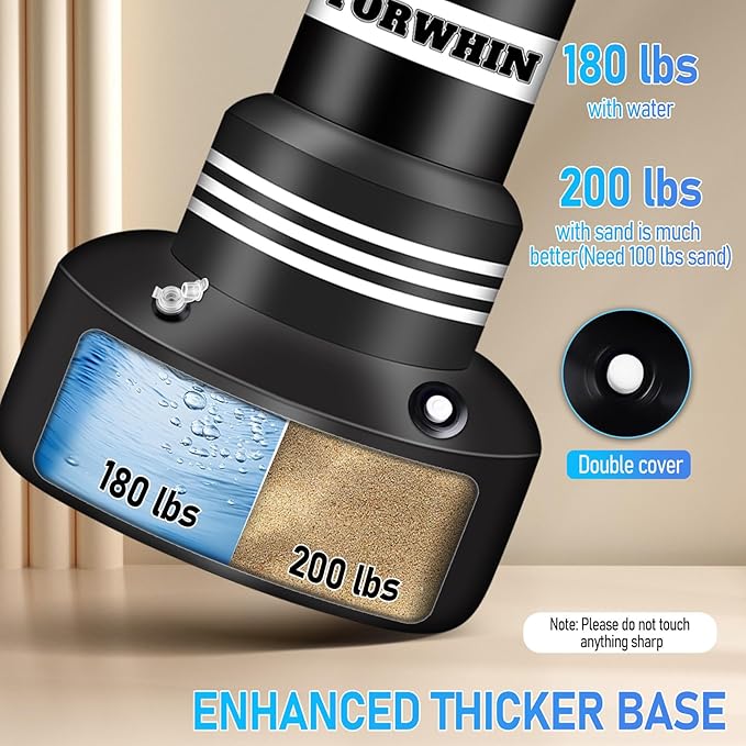 - Widened Base Punching Bag: 27.6'' widened base make the punching bag stand more stable. Fill the base with water/sand and then inflate it using the air pump. The base weighs 180 lbs when filled with water and 200 lbs when filled with sand. You can fill it with either material or a combination of both to ensure stability
