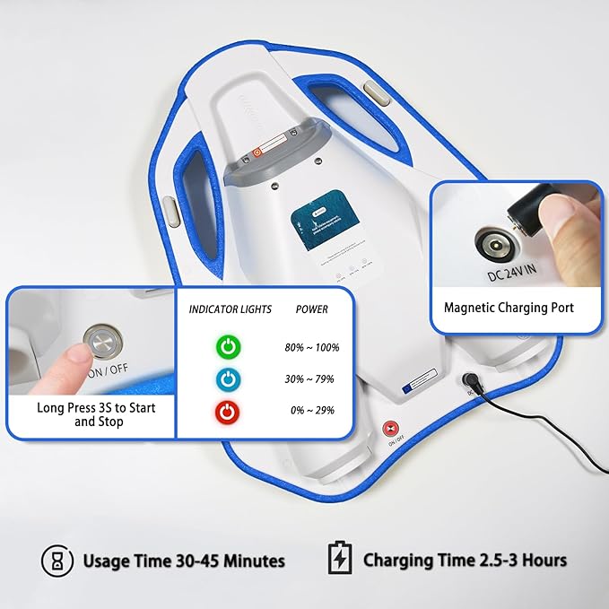 - Large-capacity battery: Electric swimming Pool Float has a built-in 24V/4.6Ah battery, with a comprehensive battery life of up to 45 minutes and a charging time of only 2.5-3 hours.