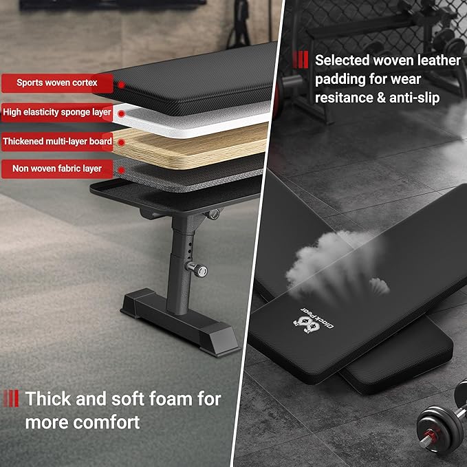 - Durable Flat Bench - Made to withstand the demands of commercial gyms, our heavy-duty bench has meticulously crafted welds and a durable matte finish that won't flake. The waterproof wear-resistant PU leather cover and 2.5" thick cushion pad provides consistent comfort, ensures long-lasting performance.