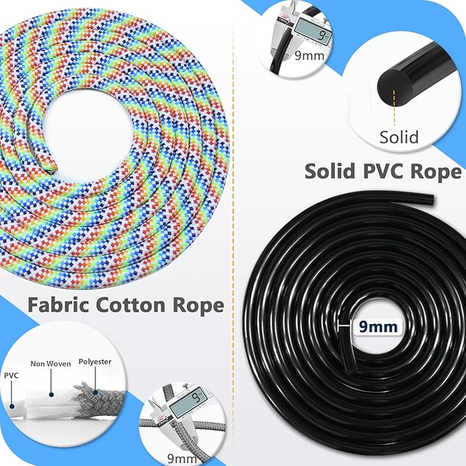 - 【2 Durable & Adjustable Ropes Combination】Skipping rope featuring a premium combination of a 9mm Thickened Cotton Rope(10ft) and a 9mm Solid PVC Rope(10ft), allowing you to easily switch between different training ropes to achieve various training goals. Suitable for a wider range of surfaces, it adds variety and excitement to your daily jump rope routine, remaining durable even after extended workouts