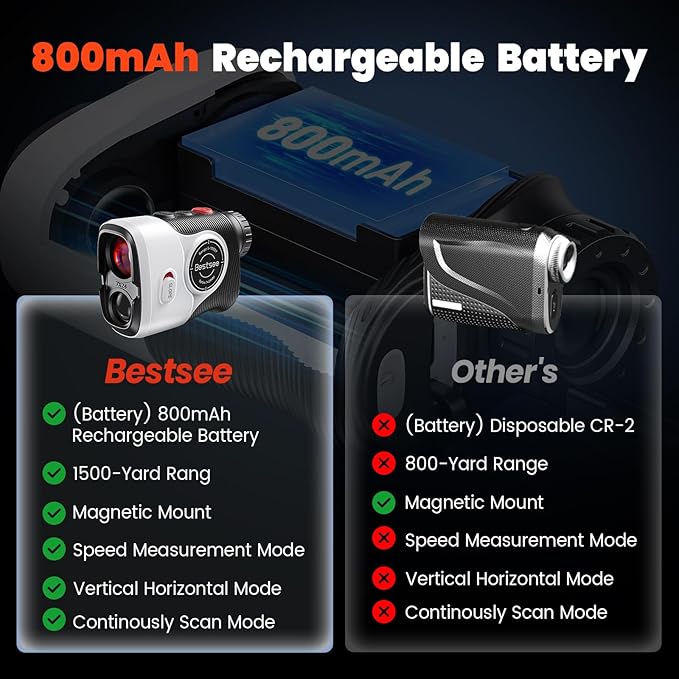 - 【15-Hour Battery & Rapid USB-C Charging】This golf rangefinder is built for serious, all-day use. The high-capacity 800mAh battery delivers up to 15 hours of continuous operation. Features auto shut-off (15s) to conserve power. Rapid USB-C charging means you'll never worry about dead batteries during rounds or trips.