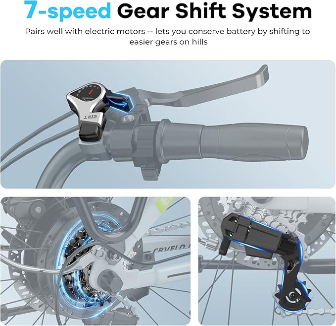 - βοΈ 7-Speed Gear System & 3 Riding Modes β Switch between throttle, pedal assist, or traditional bike mode. The 7-speed drivetrain allows smooth shifting across terrains, making this adult electric bicycle versatile for both city streets and off-road trails.