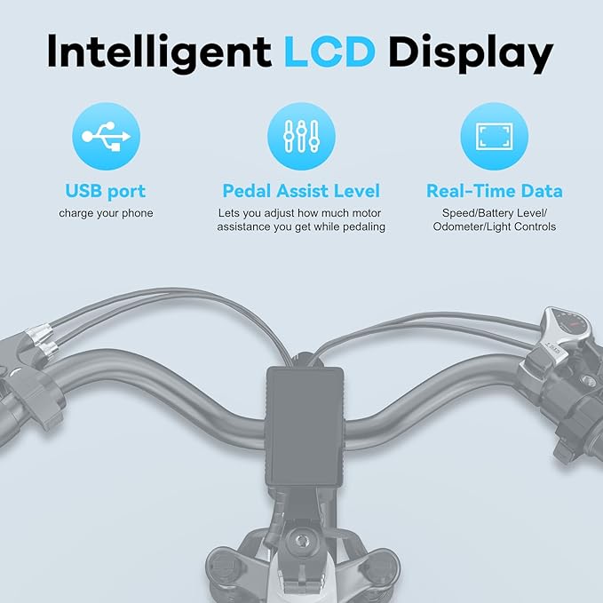 - π‘ Smart LCD Display & Safety Lights Included β The backlit LCD screen provides real-time data like speed, battery level, and distance. Front headlight and rear taillight offer enhanced visibility, making this ebike for adults perfect for day or night riding.