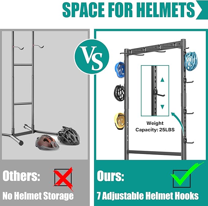 - Efficient All-in-One Bike Rack: This bike rack holds up to 7 bikes and includes 7 additional hooks on the side, for helmets and gear. This all-in-one design keeps your cycling equipment organized, accessible, and neatly stored in one compact space