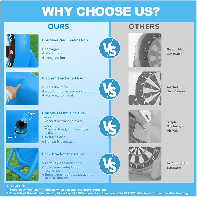 - Excellent Manufacturing Process: Inflatable dart board is made of premium-quality PVC material, which can accompany you for many years, and gives you a pleasant backyard dartboard game experience.