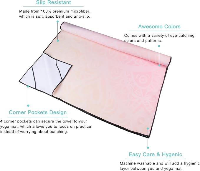 - Corner Pockets Design: Features 4 corner pockets on the backside, the non slip yoga mat towel helps secure and hold onto the mat firmly. This allows you to focus your mind, body and breath on the yoga practice, without worrying about bunching.