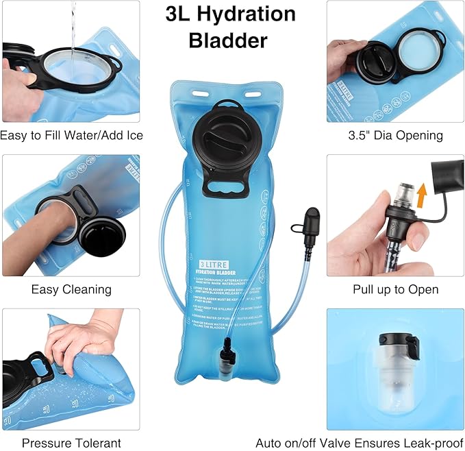 - 3-Liter TPU Water Bladder – Includes a large-capacity 3L hydration bladder made of TPU, not any BPA material. The wide screw cap makes filling with water, ice cubes, or sports drinks fast and easy, while the leak-proof bite valve ensures smooth water flow without spills. Good for keeping you hydrated during long outdoor sessions without constantly stopping to refill.