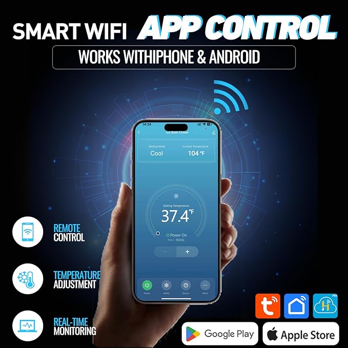 - Remote Adjustment & Quiet Operation: Using built‑in Wi‑Fi, you can adjust your chiller’s temperature from anywhere, ensuring your tub is ready when you are—all while operating below 65 dB for a peaceful recovery environment, indoors or out